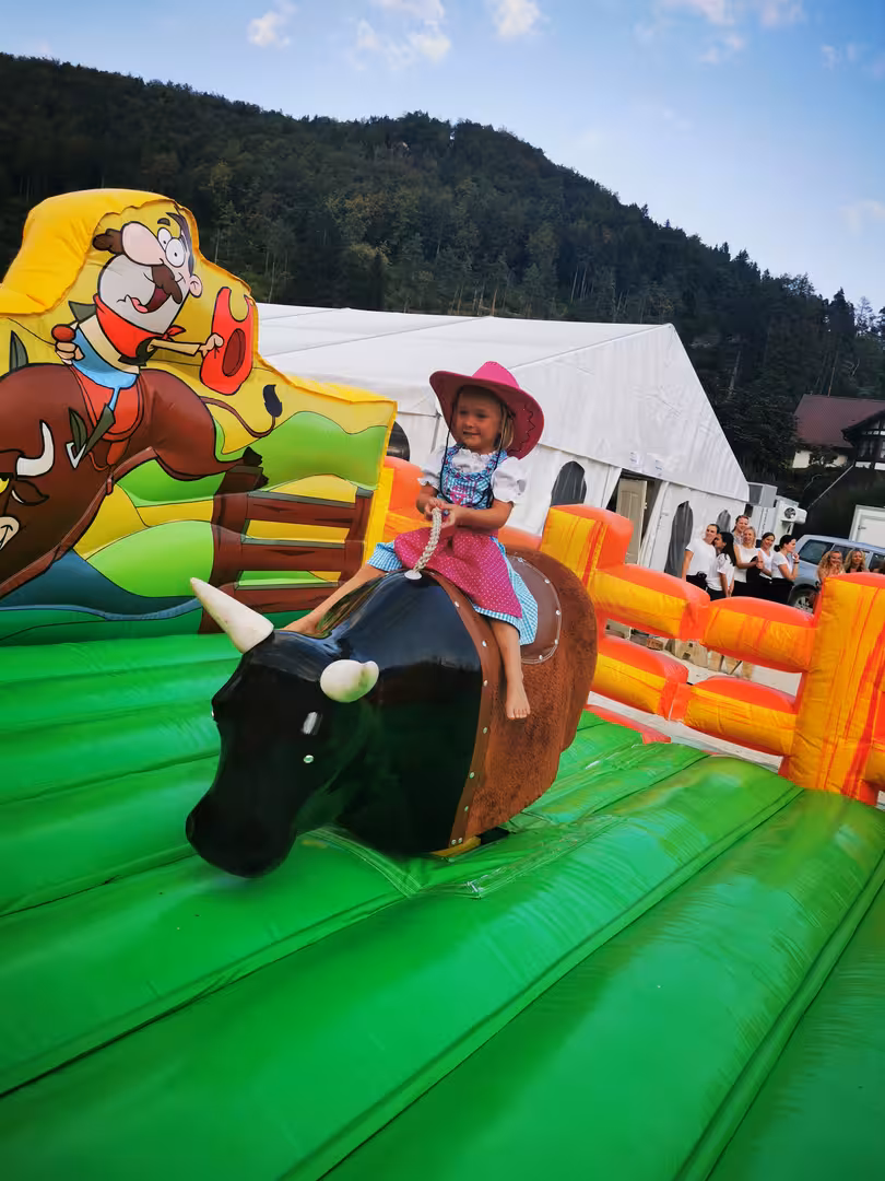 Wer schafft es am längsten auf unserem wilden Bullen? Unsere professionelle Bullriding-Anlage sorgt für Nervenkitzel und jede Menge Spaß! Mit drei verschiedenen Schwierigkeitsstufen ist sie für Kinder und Erwachsene geeignet. Die weiche Luftpolster-Umrandung garantiert maximale Sicherheit.